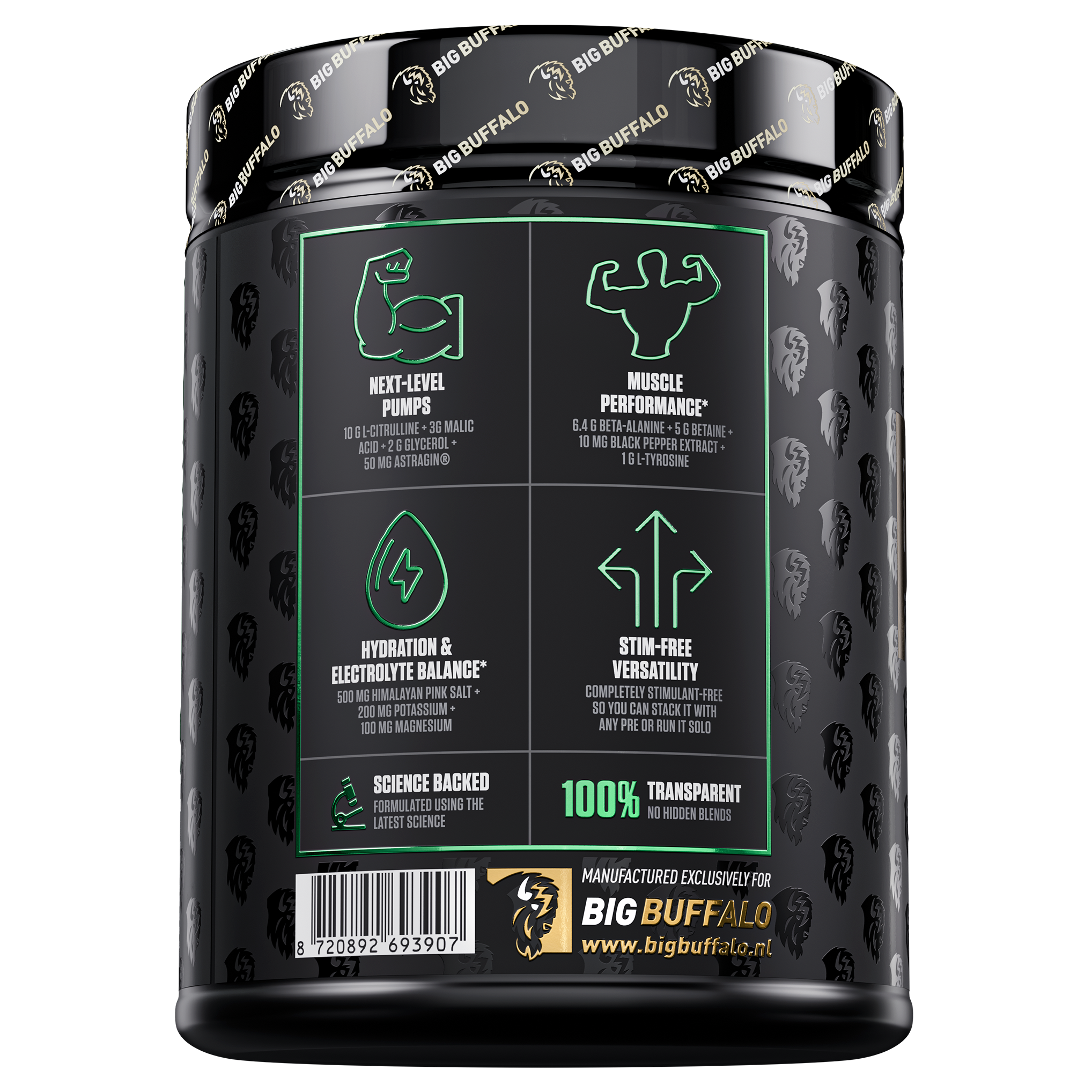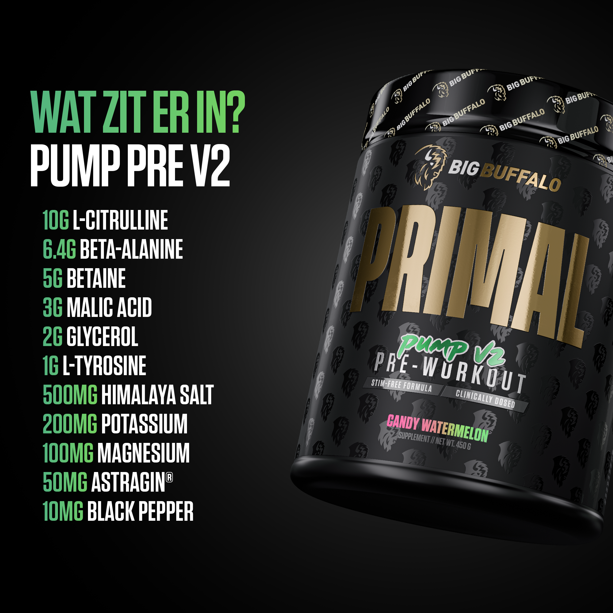 Primal Pump V2 is geen standaard cafeïnevrije pre-workout. Elke dosering bevat 10g L-Citrulline, 6.4g Beta-Alanine, 5g Betaïne, 3g Malic Acid en 2g Glycerol, aangevuld met elektrolyten. Perfect voor late-night lifts, een cafeïne-break of als aanvulling op je favoriete pre.- Volledig cafeïnevrije 3-in-1 pre-workout